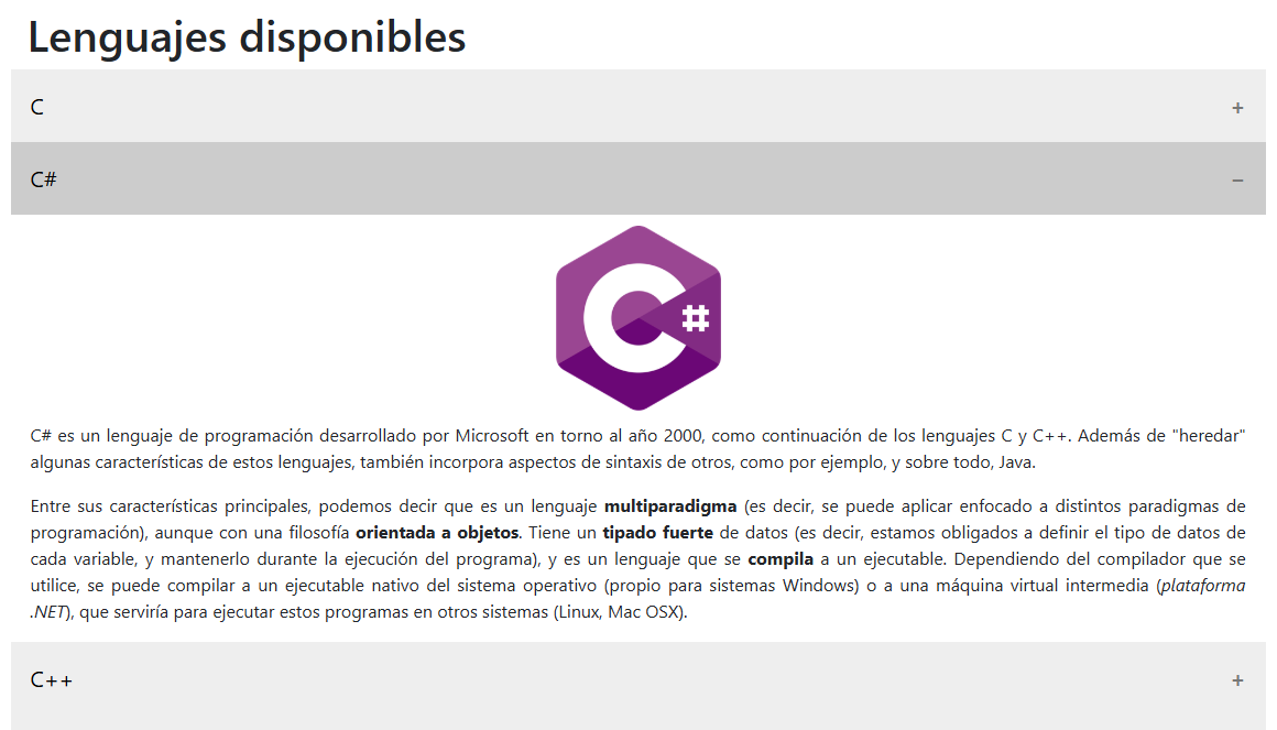 Al desplegar cualquier lenguaje, aparecerá un logo del mismo con algún breve párrafo introductorio: