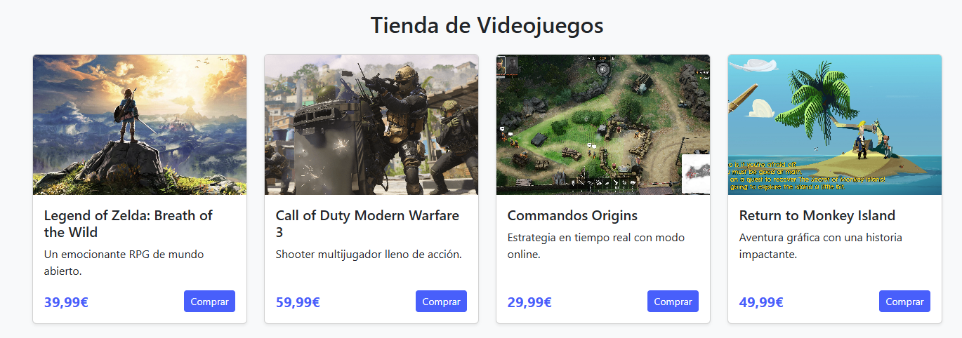 Define una página Bootstrap que muestre información sobre distintos videojuegos en venta, cada uno en su tarjeta. Se mostrarán en 4 columnas en pantallas lg o superior, y en 1 columna en tamaños inferiores.