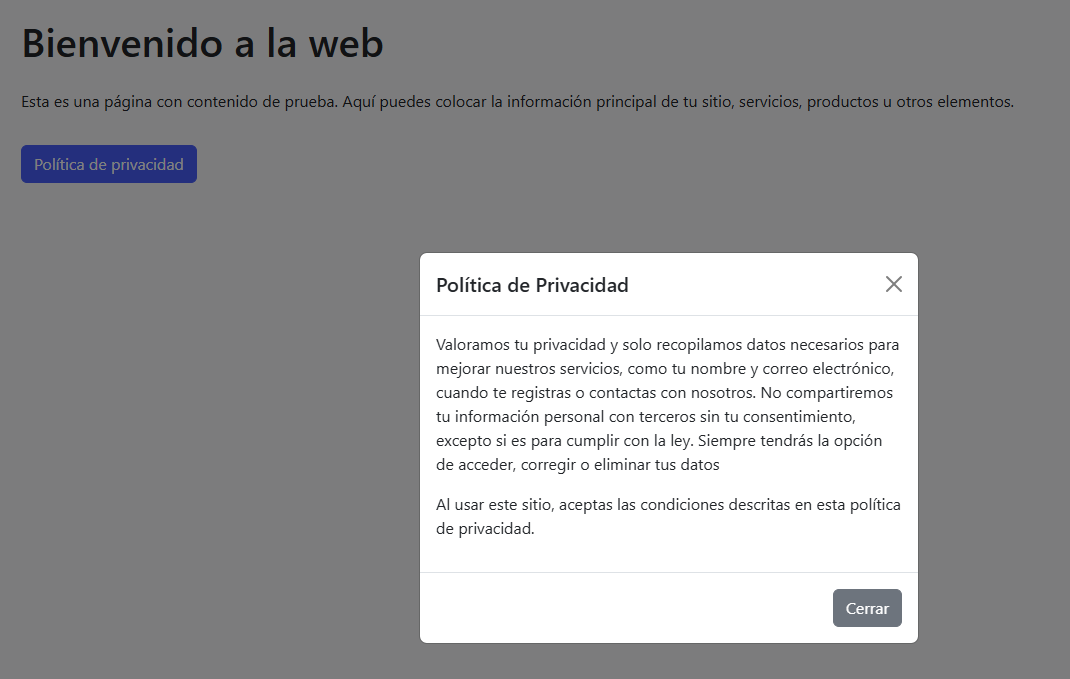 Crea una página con Bootstrap que tenga un botón con el texto "Política de privacidad" (entre otros contenidos de prueba). Al pulsarlo se mostrará un diálogo modal centrado con un texto de política de privacidad similar a este: