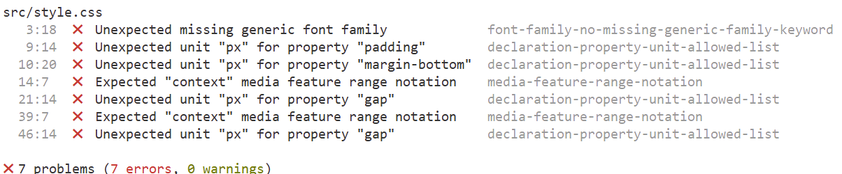 "unit-allowed-list": ["%", "vw", "px", "rem", "vh", "fr", "em"],