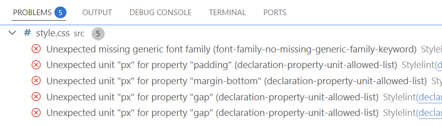 Cada vez que guardemos cambios en el CSS, podremos ver en la pestaña Problems del terminal de Code (y también marcados en rojo en el CSS) los errores que ha detectado.