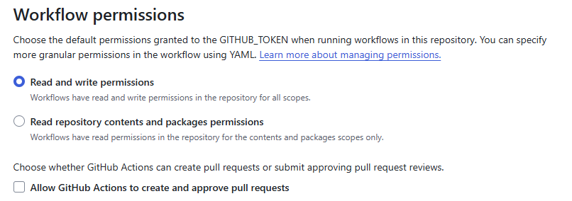 Por defecto GitHub Actions sólo tiene permisos para leer el repositorio, pero no para hacer cambios en él. En este caso le estamos pidiendo que vuelque los cambios de la web en la rama gh-pages, así que tenemos que habilitar estos permisos. Vamos a las Settings de nuestro repositorio, y buscamos Actions > General en el panel izquierdo. Accedemos a la sección que pone Workflow permissions y marcamos la casilla de lectura y escritura: