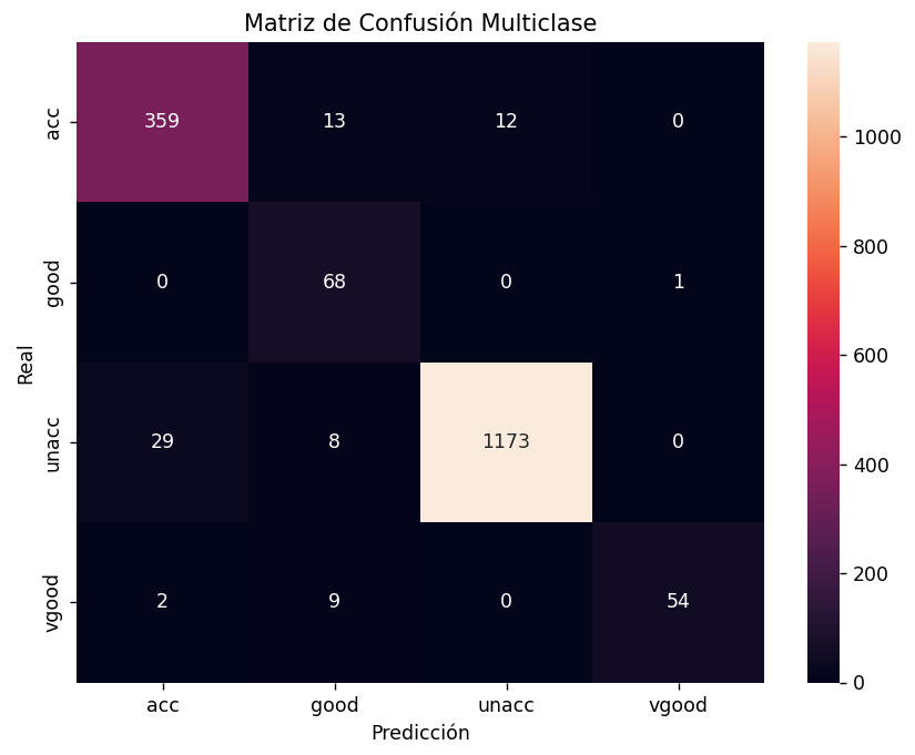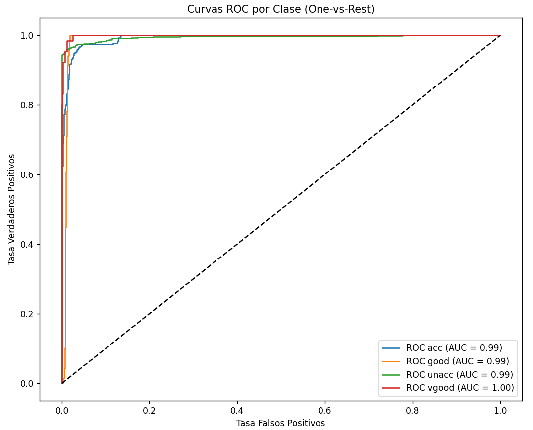- Vemos que el F1 Score para casos inaceptables es del 98%, ya que la precisión es del 99% y la sensibilidad del 97%. Esto significa que detecta casi todos los casos inaceptables reales (sensibilidad), y casi todos los que ha etiquetado como inaceptables realmente lo eran.